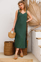 Натуральное платье с дизайнерской вышивкой в тон по лифу переда. По боковому шву разрезик. Спинка со средним швом, молнией.