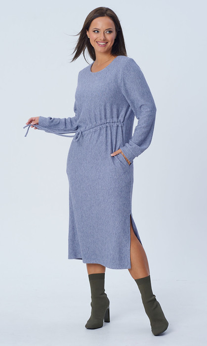 Стильное трикотажное платье с полукруглой горловиной ,карманы по боковым швам и разрезом с одной стороны и ещё с одним привлекательным акцентом по линии талии ввиде кулисы со шнурком. Это даёт возможность делать платье как полуприлегающим, так и свободного вида. Обладательница такого наряда будет себя чувствовать привлекательной в любой ситуации.