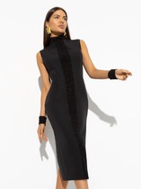 Платье женское полуприлегающего силуэта длинной за колено из легкой плательной ткани. Спинка платья цельнокроеная в области лопаток декоративные подрезы, так же обработаны талиевые выточки для лучшей посадки изделия по фигуре. По полочке центральная застежка на цельнокроеных планках, застегивающихся на петли и пуговицы. Воротник – стойка. Рукава втачные, длинные по низу притачная манжета, застегивающаяся на петлю и пуговицу. Для удобства в боковых швах обработаны карманы. Платье дополнено съёмным поясом из основной ткани.