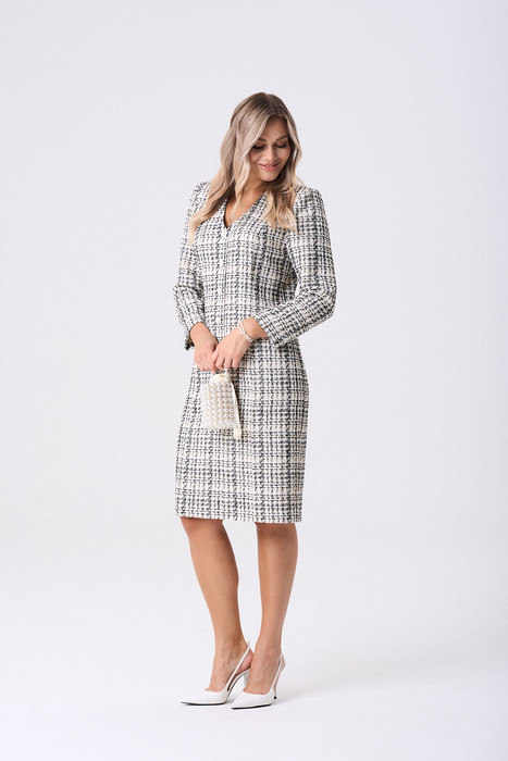 Платье женское полуприлегающего силуэта в стиле шанель длинной ниже колена. По полочке обработаны рельефы, в среднем шве функциональная планка, затягивающаяся на петли и пуговицы до линии бедра. Вырез горловины V-образный. По спинке обработаны талиевые выточки. Рукав втачной, длинный.