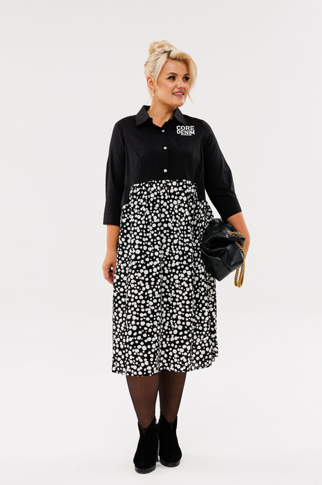 Платье женское из 2-х видов блузочной ткани (однотон и горох) прямого силуэта. По полочке идет фигурный подрез под грудью, переходящий в фигурный подрез по спинке. По юбке по подрезу идет сборка и клапаны. По полочке идут грудовые выточки из проймы. Застежка - планка на петли и пуговицы. Воротник с отрезной стойкой. По спинке - отрезная кокетка. Рукав 3/4 длины на манжете. В качестве декора -термонаклейка в верхней части полочки. Длина по спинке (верх): (50-54) - 42см, (56-60) -44см. Длина (юбкапо боку): (50-54)-75см, (56-60)-77см. Длина рукова с манжетой:(50-54)-46см, (56-60)-47см