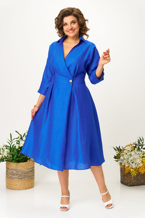 Элегантное женское палтье  из натуральной ткани (премиальный лен) необычного кроя станет изюминкой вашего гардероба. Платье полуприлегающего силуэта, отрезное по линии талии со спущенным плечом. Рукав 3/4 длиный на отрезной манжете.  По полочке идут защипы-складки в верхней и нижней частях, запах - на петли и пуговицы по подрезу. По нижней части платья запах идет в виде складки.  По спинке кокетка со складкой, по подрезу вставлена резинка.  Юбка-полусолнце с односторонними  складками по полочке, по бокам карманы. По горловине воротник на отрезной стойке. Длина по спинке: 117см. Длина рукава с манжето 29см.