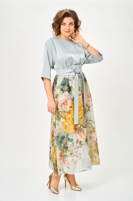 Платье выполнено из однотонной ткани с атласным эффектом в сочетании двух цветов. Платье длинной макси с акцентом в области талии в виде съемного пояса "кушак". Платье отрезное по линии талии. Полочка с горловиной овальной формы. Спинка со средним швом, в верхней части которого обработана капля-разрез с застежкой на навесную петлю и пуговицу. Рукав одношовный длиной 3/4. Юбка формы колокол. В боковых швах юбки обработаны карманы. По талии платье с эластичной тесьмой. В боковых швах лифа обработаны шлёвки, через которые продевается пояс-кушак