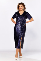 Полочка платья с центральной застежкой на молнию и вертикальными рельефами. Горловина V-образной формы с отложным воротником. Спинка с вертикальными рельефами. В области талии от рельефа спинки до рельефа полки обработан