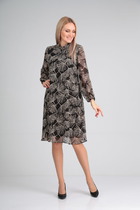 Элегантный полуприлегающий силуэт, низ платья слегка расширен. Перед с фигурным подрезом и сборкой в области груди. V-образный вырез горловины, втачной рукав. Верхняя часть рукава с легкой сборкой по окату, низ рукава на резинке. Спинка с фигурным подрезом в области талии, верхняя часть спинки со сборкой. Потайная молния по боковому шву.