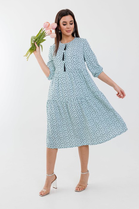 Отрезное выше линии талии, свободного покроя и круглым вырезом горловины. Нам нравятся такие модели: романтичные на первый взгляд и чувственные при ближайшем рассмотрении. Мягкая на ощупь ткань красиво ложиться в каскаде воланов. Красивые втачные рукава со складкой по низу и пуговицами!