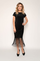 Платье А-силуэта длинной миди. Горловина обработана воротником стойка с рюшей, по спинке вырез "капелька" с застёжкой на навесную петлю и пуговицу. По переду платья нагрудные вытачки, со средним швом по спинке. Рукав втачной длинный, со сборкой по окату и на резинке по низу.