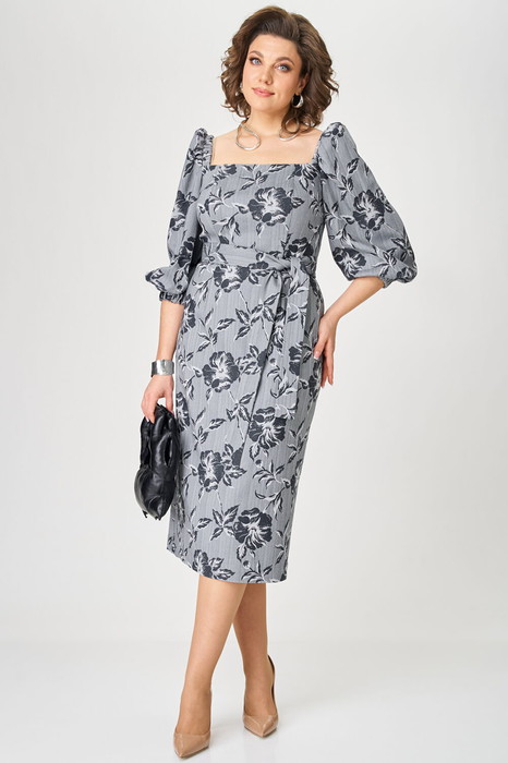 Платье приталенного силуэта, чуть ниже колена из костюмно-плательной ткани. Вырез горловины квадратной формы. Отрезное по линии талии. Перед и спинка с рельефами. По спинке средний шов, в котором вставлена потайная молния, внизу разрез. Рукав втачной широкий длинный, по окату собран на резинку. Длинный рукав легко превратить в три четверти с помощью резинки, вставленной по низу рукава. В комплект входит пояс из основной ткани.