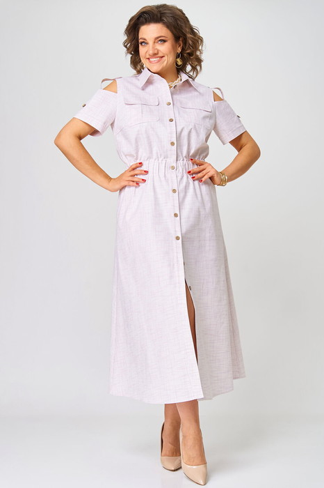 Платье полуприлегающего силуэта, расклешенное книзу. Воротник отложной, на притачной стойке. Платье отрезное по линии талии, на широкой резинке. Платье с центральной застежкой на петли и пуговицы на притачных планках. Полочка с нагрудными вытачками и накладными карманами со складкой и клапаном. В боковых швах юбки функциональные карманы. Рукав втачной короткий, с открытым плечом, понизу - притачная манжета и декоративная пата на пуговице.