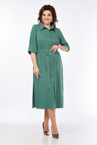 Платье женское полуприлегающего силуэта из костюмно-плательной ткани. Горловина округлой формы. Перед с нагрудными вытачками. Спинка с талиевыми вытачками, застежкой на молнию и разрезом в среднем шве. Рукав втачной прямой длинный с разрезом и декоративной застежкой на петли и пуговицы. По низу платья в боковом шве высокий разрез. Декорировано платье съемным бантом.