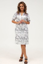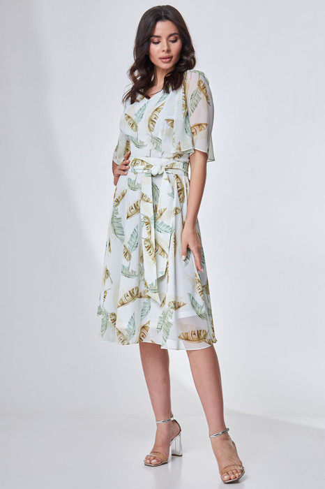 Платье полуприлегающего силуэта, расклешенное книзу, на трикотажной подкладке. Горловина V-образной формы. Платье отрезное по линии талии. По переду нагрудные и талиевые вытачки. Спинка с рельефами и потайной застежкой молнией в среднем шве. Рукав втачной расклешенный короткий, со сборкой по окату. В комплекте съемный пояс из основной ткани.