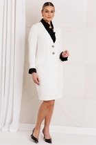 Платье А-силуэта, расклешенное книзу. Воротник-стойка, декорирован рюшей и завязками. Платье по линии талии собрано на венгерку. По переду застежка на навесные петли и пуговицы. Спинка со средним швом. Рукав втачной длинный, собран на венгерку по низу. В комплекте съемный чехол.