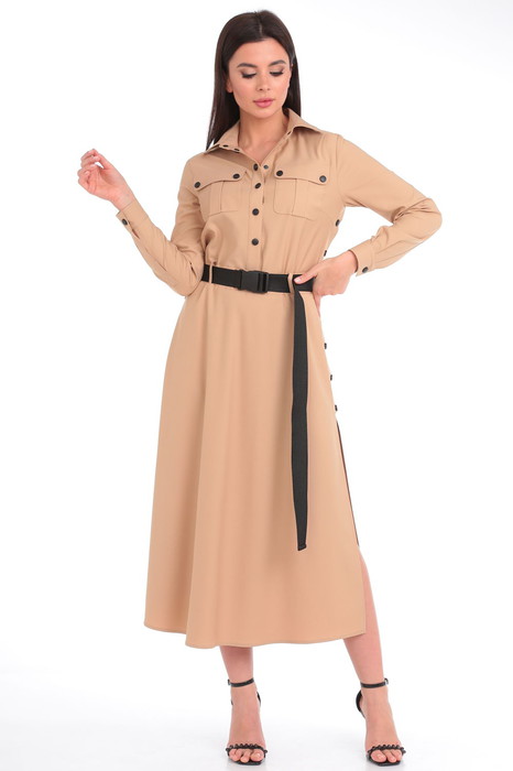 Лаконичное женское платье выручит свою обладательницу в любой ситуации. Благодаря своей универсальности платье отлично подойдет для любого мероприятия или повода: на деловой или дружеской встрече, в офисе или кафе. Платье полуприлегающего силуэта, расклешенное книзу. Воротник рубашечного типа на притачной стойке. Платье отрезное по линии талии, со шлевками для пояса. Полочка с центральной застежкой на притачных планках на контрастные кнопки, нагрудными вытачками и накладными карманами со складкой и клапаном. В боковых швах юбки планки с застежкой на контрастные кнопки и разрезы. Рукав втачной длинный, понизу с притачной манжетой с застежкой на кнопку. В комплект входит пояс из стропы.
