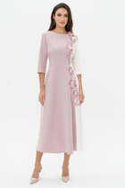 Платье полуприлегающего силуэта выполнено из полотна с абстрактным контрастным принятом. Характеристики: прилегающий силуэт, подкладка, отрезное, по отрезу фигурная вставка со сборкой, горловина V образный вырез, по переду изделия не функциональные пуговички, рукав втачной по низу рукава манжета на резинке, по спинке в области фигурной вставки - резинка венгерка, низ в изделии свободного кроя на подкладке. Длина изделия по спинке 90 см, длина рукава 57 см.
