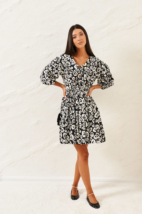 Яркое платье полуприлегающего силуэта выполнено из хлопкового полотна с абстрактным цветочным принтом. Характеристики: полуприлегающий силуэт, отрезное, отрез на резинке, V образный плавный вырез горловины, крупный воротник, по периметру воротника декоративная сборка из ткани основою изделия, рукав втачной, низ рукава на резинке, низ изделия свободного кроя на подкладке. Длина 89 см, длина рукава 41 см.