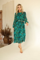 Платье полуприлегающего силуэта выполнено из полотна цвета медь с принтом полевые цветы. Характеристики: полуприлегающий силуэт, отрезное выше талии, фигурный вырез горловины, по переду в области груди декоративная не съёмная деталь, низ и верх рукава на резинка, застежка потайная тесьма молния в среднем шве заднего полотна изделия, юбка в изделии свободного кроя с разрезом (разрез 34 см). Длина по спинке от верхнего края рукава 133 см, длина рукава 63 см.
