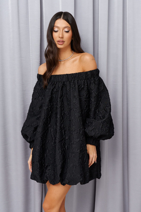Платье прямого свободного кроя с полуоткрытими плечами, выполнено из черного фактурного полотна. Характеристики: прямой свободной крой, подкладка, верх и низ изделия на резинке, рукав обьемный, по низу рукова резинка. Длина по спинке 70 см, длина рукава от края горловины 58 см.