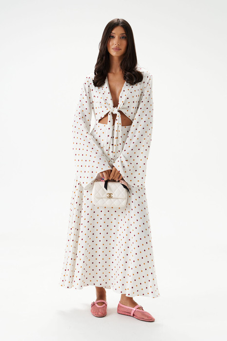 Платье полуприлегающего силуэта, выполнено из текстильного полотна в горох.Характеристики: горловина V образный вырез, грудь фиксируется декоративными детялями завязывающимися на бант, рукав втачной к низу расширен, юбка свободного кроя на подкладке, застежка центральная - молния по спинке.Длина платья 130 см, длина рукава 67см.