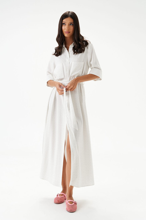 Платье прямого свободного кроя выполнено из текстильного полотна в мелкий горошек. Характеристики: прямой свободный крой, отложной воротник, застежка центральная на петли пуговицы, по линии талии нашиты шлевки, в комплекте пояс из ткани основного изделия, по переду расположены карманы, рукав свободного кроя, по низу рукава подгиб. В боковых швах разрез 52 см.Длина изделия по спинке 133 см, длина рукава 33 см.