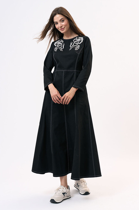 Платье полуприлегающего силуэта, отрезное по линии талии с декоративной вышивкой. Рукав длинный, втачной, горловина круглой формы. В боковых швах обработаны карманы. На спинке обработана застежка на тесьму-молнию. Возможно отличие фотографии по оттенку, связанное с разной цветопередачей монитора.