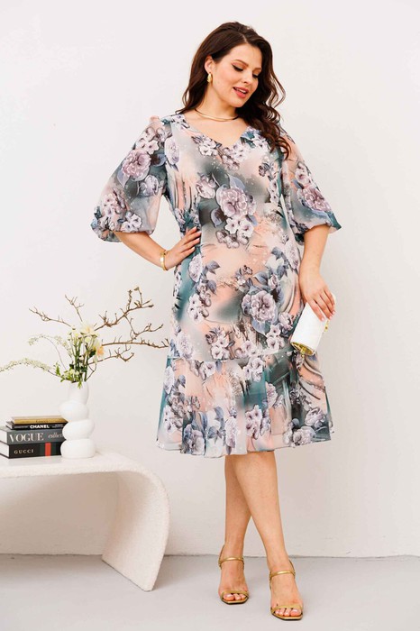 Платье женское свободного силуэта из плательной ткани. Рукав три четверти, силуэт свободный. Горловина V-образная. Перед с кокеткой, из-под которых две складки. Рукав присборен по окату, расширен на резинку по низу. Спинка свободная. По низу платья клешёный волан.