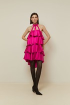 Платье женское свободного силуэта из плательной ткани. Рукав три четверти с присборенным воланом. Горловина V-образной формы. Перед с наагрудными вытачками. Платье отрезное ниже линии бедер. Волан присборен к линии притачивания. Платье без застежки