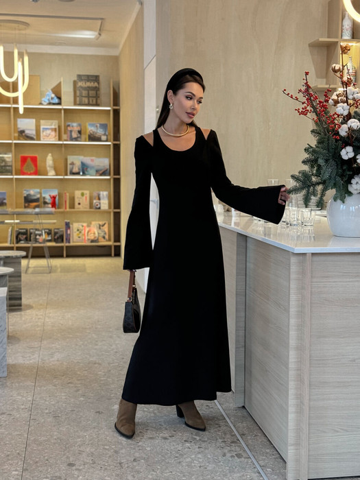 Платье в длине макси выполнено из трикотажа среднеей плотности. Верх платья обработан глубоким вырезом-лодочка и бретелями, имитирующими майку