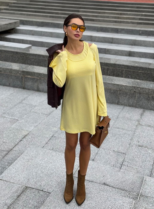Платье в длине мини, выполнено из трикотажного полотна, который представляет собой ряд выпуклых вертикальных полос из «косичек».  Верх платья обработан глубоким вырезом-лодочка и бретелями, имитирующими майку. Рукав расширяется к низу, по форме клеш. Платье хорошо тянется, идеально сядет н афигуру..