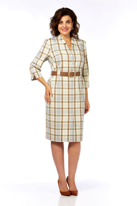 Женское платье полуприлегающего силуэта выполнено из плательно-костюмной ткани в клетку. Платье с центральной застёжкой на 3 петли и пуговицы . Перед со средним швом заканчивающимся шлицей, рельефами из пройм до боковых швов,в швах выполнены карманы,и нагрудными вытачками.Спинка цельная.По переду и спинке в области талии выполнены шлевки для ремня. Рукава втачные , двухшовные, длиной 3/ 4. Внизу верхнего шва рукава декоративные пуговицы и разрез. Вырез горловины фигурный со стойкой.