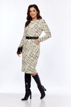 Женское платье полуприлегающего силуэта выполнено из трикотажного полотна с оригинальным дизайном.Перед с отрезными бочками от проймы до бокового шва ,в шве выполнены карманы.Спинка с талиевыми вытачками ,со средним швом, застёжкой на декоративную тесьму-молнию и разрезом.Рукава втачные длинные двухшовные.Платье укомплектовано ремнем из искусственной кожи.