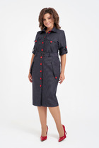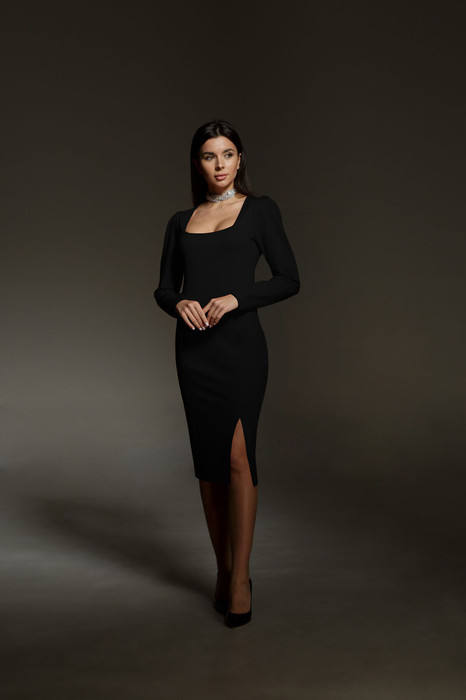 Женское платье из плотной хорошо тянущеся трикотажной ткани. Платье прилегающего силуэта, отрезное по линии талии. По полочке талиевые вытачки, переходящие в рельефы на юбке платья, в одном из рельефов по низу разрез. Горловина квадратной формы. Рукав втачной, со складками по окату. Спинка со средним швом.