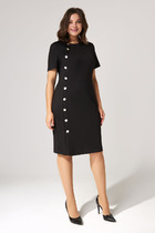 Платье женское полуприлегающего силуэта, выполнено из трикотажной ткани, с подрезом под линией груди и сборкой, с воротником, переходящим в капюшон на спинке в контрастном цвете, рукав втачной 3/4, украшение в комплекте. Длина платья по спинке 104 см.