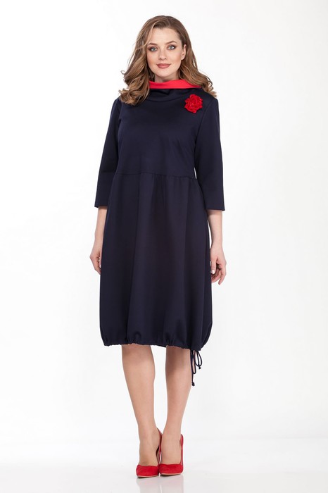 Платье женское полуприлегающего силуэта, выполнено из трикотажной ткани, с подрезом под линией груди и сборкой, с воротником, переходящим в капюшон на спинке в контрастном цвете, рукав втачной 3/4, украшение в комплекте. Длина платья по спинке 104 см.