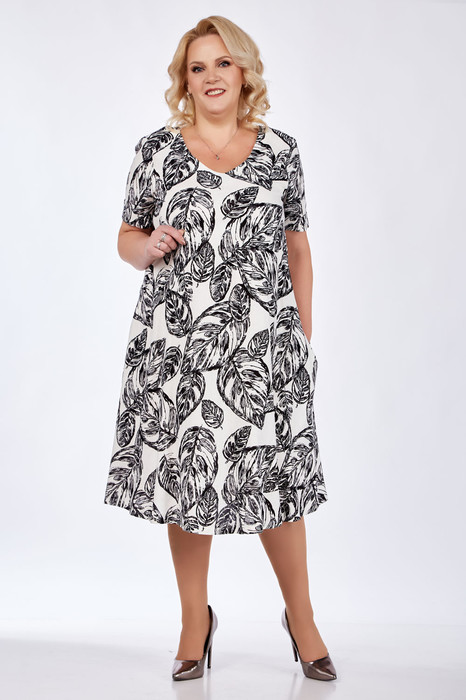Платье женское свободного силуэта. Рукав втачной с отложным манжетом, вырез V- образный по полочке и спинке, в боковых швах карманы. Длина изделия 112 см.