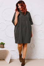 Платье полуприлегающего силуэта, по переду в верхней части лифа отрезные бочки. Горловина круглая, по линии талии декоративные элементы с пуговицами. Рукава втачные расширенные к низу, по переднему шву с разрезом. Застежка на тесьму молнию в среднем шве спинки.