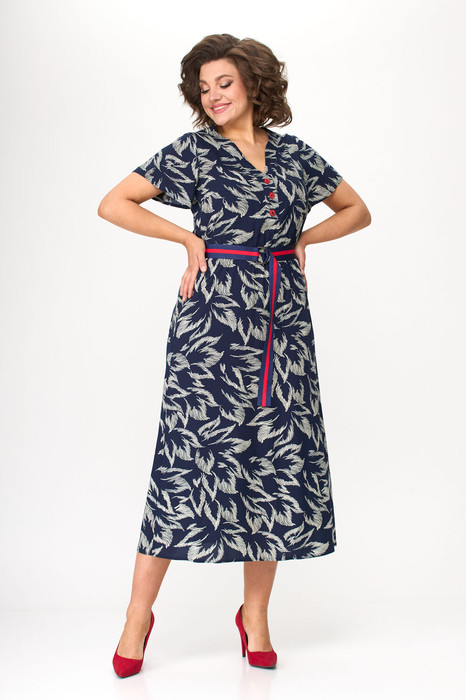 Платье полуприлегающего силуэта, отрезное по линии талии. По переду фигурный вырез с планкой, на планке пришиты контрастные пуговицы. Юбка немного расширена к низу, по боковым швам разрезы, на уровне бедер в боковых швах карманы. Рукава втачные, короткие, расширенные к низу.