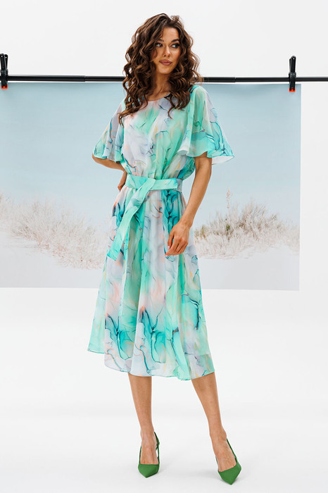 Платье полуприлегающего силуэта, отрезное по талии на резинке и расклешенным низом. Платье с втачным коротким рукавом. Спинка с вырезом-каплей и затежкой на новесную петлю-пуговицу. Платье на подкладке.