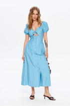 Платье-миди А-силуэта с асимметричными вставками. Диагональная линия, делящая платье, создает интересную композицию, визуально вытягивают фигуру, делая ее более стройной и пропорциональной. Принт "гусиная лапка" располагается диагонально на лифе слева и переходит на юбку справа, создавая эффект "сдвига" и визуальной динамики. Горловина округлой формы, рукава длинные, втачные. На концах имеют легкую сборку, что добавляет романтичности. Юбка, с боковыми карманами и плавным расширением к низу, обеспечивающим комфорт и свободу движения.