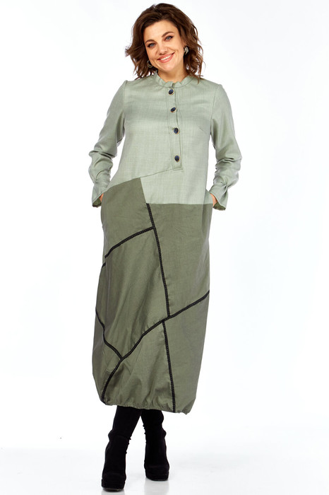 •  Силуэт: Прямой, слегка расширяющийся к низу. Модель предполагает свободную посадку по фигуре. Нижняя часть платья имеет сложный крой, создающий эффект "баллона" или асимметричного многослойного объема.