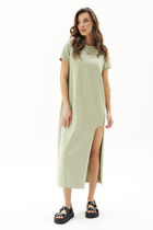Платье миди, силуэт полуприлегающий в верхней части, переходящий в расклешенный А-силуэт к низу, создающий эффект удлиненной и струящейся фигуры. Воротник широкий, плоский, отложной, с закругленными краями. Лиф с застежкой на петли пуговицы. Декоративный ряд контрастных пуговиц, подчеркивает V-образный вырез и утончает силуэт. Для лучшего прилегания в платье выполнены нагрудные выточки и выточки по спинке, для большего удобства обработаны карманы-хулиганы. Рукава длинные, втачные, с легкой сборкой на манжетах, что добавляет мягкости и женственности. По полочке  и спинке идет подрез чуть ниже линии талии, от которого по полочке юбки выполнена встречная складка. Длина изделия по спинке 120 см., длина рукава 62 см.