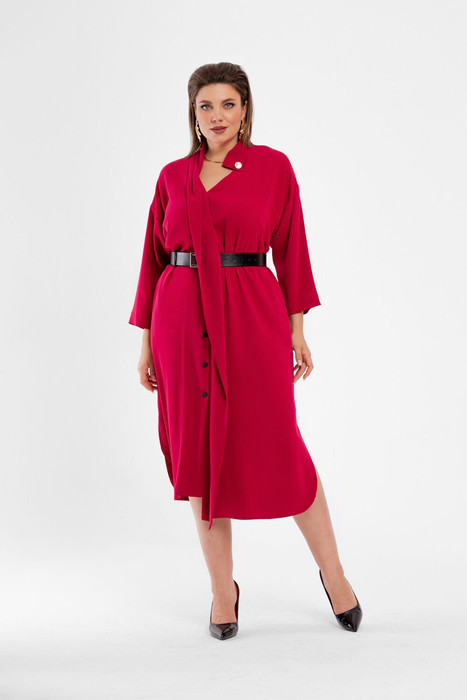 Платье женское свободного силуэта с карманами в боковых швах и асимметричным низом. Вырез горловины оформлен отложным воротником переходящим в декоративную планку. Рукава отрезные на базе цельнокроеных.   В боковых швах- разрезы.  Длина спинки - 120 см. Длина рукава от линии горловины - 63 см.  Изделие дополнено съемным поясом. Отделочная фурнитура может меняться.