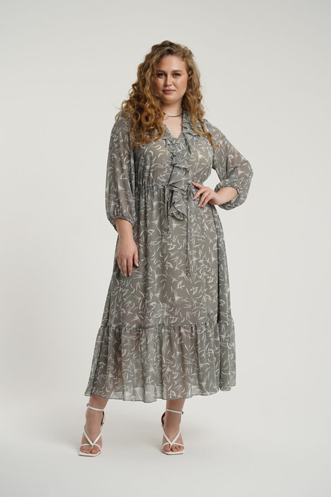 Платье женское из шифона на подкладке. Вырез горловины V-образный, декорирован воланами. Рукав объемный отрезной, присборен на эластичную тесьму. По линии талии отрезное с эластичной тесьмой. По низу изделия волан.