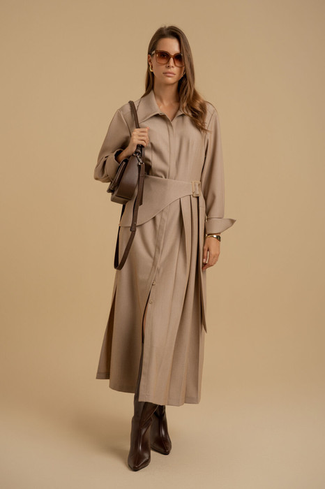 Платье женское приталенного силуэта из костюмной ткани. Вырез горловины оформлен воротником рубашечного типа. Застежка - потайная на петли с пуговицами. Рукава - втачные с мягкой складкой в области оката. Низа посажены на отрезные манжеты с застежкой на петли с пуговицами. Отрезное по линии талии. В боковых швах имеются карманы. Справа выполнен разрез, слева - складки. Изделие декорировано съемной баской.
