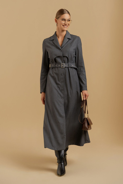 Платье женское А - силуэта из костюмной ткани. Вырез горловины оформлен воротником пиджачного типа с застежкой на петли с пуговицами. Рукава - втачные. В боковых швах выполнены карманы. Спереди и сзади изделие декорировано кокетками сложной архитектурной формы. При помощи пояса из основной ткани возможно создать приталенный силуэт.