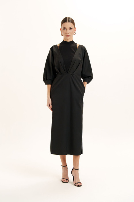 Красивое, стильное и элегантное  платье прямого силуэта  выполнено из хлопкового  полотна и элит трикотажа. Модель платья классика с рукавом 3/4 ЛЕТУЧАЯ МЫШЬ, низ рукава на манжете. Горловина оформлена воротником - стойка из отделочной ткани с застежкой по спинке на потайную молнию , что делает платье универсальным нарядом в гардеробе любой женщины или девушки. На платье обработан подрез со складками. По боковому шву разрез.