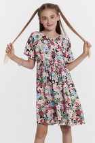 Платье из легкой хлопковой ткани, расклешенное к низу. Рукав втачной, короткий. Спинка отрезная выше талии. Средняя часть полочки украшена шелкографией. Горловина отделана узкой обтачкой из эластичной ткани. Ткань гипоаллергенная, хорошо пропускает воздух.