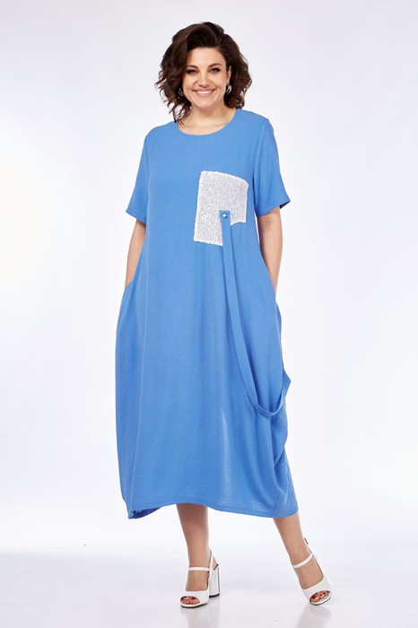 Платье женское, полуприлегающего силуэта, расширенное к низу. По спинке средний шов с разрезом понизу. По переду нагрудные вытачки, отделочный накладной карман с поясом, который фиксируется в боковом шве. В боковых швах-карманы. Рукав втачной-короткий.
