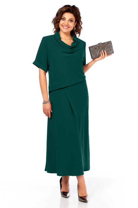 Платье женское длиной до середины икры, слегка расклешенное к низу. Спинка с косым передом в области талии и средним швом до разреза. Перед с косым подрезом в области талии, образующий мягкую складку из лифа и 1 глубокую складку от подреза вниз. Горловина с рубашечным воротником на стойке и драпировкой в виде качели. Рукав втачной с отложными манжетами.