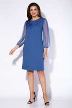 Платье женское, полуприлегающего силуэта, отрезное по линии талии. Лиф со смещёнными рельефами и с нагрудными вытачками. Спинка лифа с рельефами, выходящими из проймы. Юбка, зауженная к низу, с талевыми вытачками. Рукава реглан из гипюра, длинные. Горловина комбинированная, перёд с V-образным вырезом. Горловна со стойкой. В среднем шве спинки обработана застёжка на потайную тесьму молнию и шлица. Талию украшает отлетной пояс из ткани.