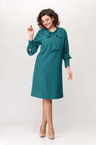 Платье полуприлегающего силуэта из трикотажного полотна. На спинке в среднем шве обработан вырез капелька с навесной петлей, обработана потайная молния и шлица. Ассиметричный верх выполнен по правому плечу из мягкой сетки. На левом плече сьемный элемент в виде двойного банта.